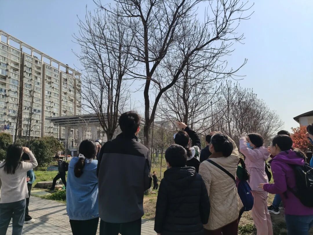 理论知识讲解结束后,最令人期待的实地观鸟环节来临。大家手持望远镜,来到了社区附近的湖边,小心翼翼地寻找着鸟儿的踪迹。春阳暖照下,大家轻步缓行,屏息凝神,循着鸟鸣调整望远镜角度。“快看!那边树上有只‘小胖墩’在梳羽毛!”一位小朋友压低声音兴奋示意,其他孩子也兴奋地指着天空,轻声呼喊着自己的新发现,主讲老师和家长们则在一旁耐心地引导,帮助他们辨认鸟儿的品种。整个观鸟过程中,大家以知识为眼,以行动为媒,共同探寻着身边这触手可及的“自然诗意”。