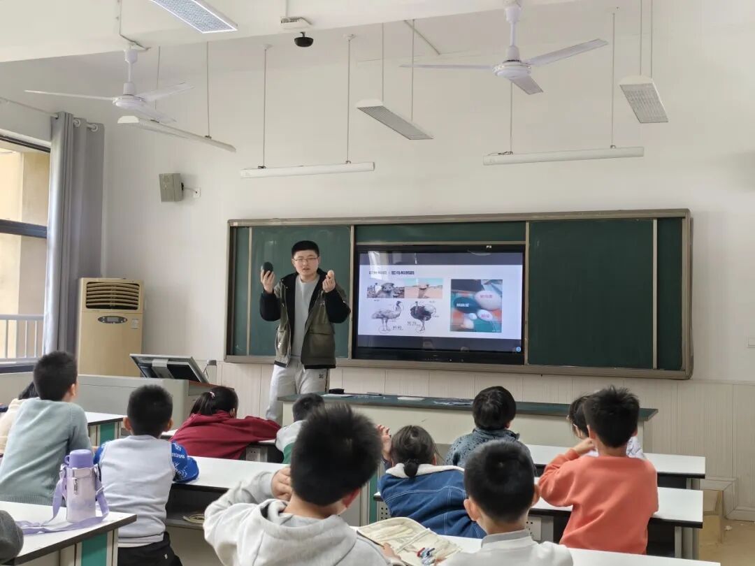 主讲人还带领小朋友走进现代家禽家畜的世界,认识很多常见的牛羊鸡犬。本次课堂主讲人还带来了一个鸡蛋和鸸鹋蛋,孩子们通过触摸蛋壳的纹理和对比大小的差异,认知到家禽的多样性。