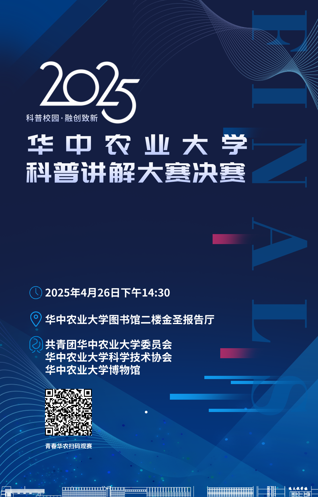 初夏时节,狮子山下,一场知识与趣味交融、科学与创新碰撞的盛宴即将拉开帷幕!2025年华中农业大学科普讲解大赛决赛,将于4月26日下午2:30,在图书馆二楼金圣报告厅精彩呈现。让我们共同期待这场智慧与灵感的交汇,见证科学魅力的绽放!