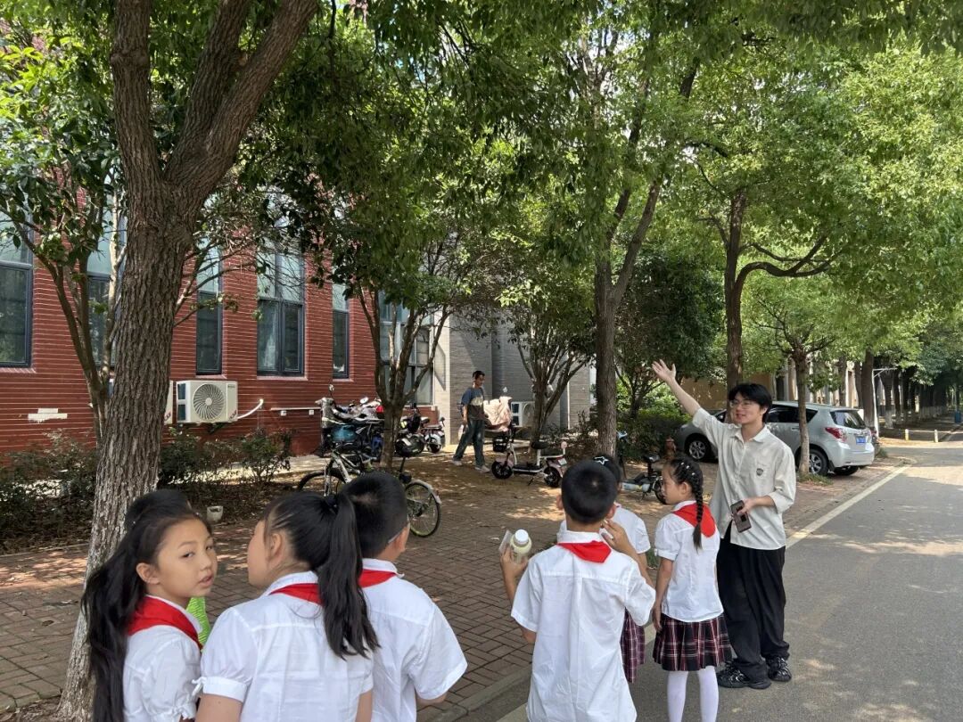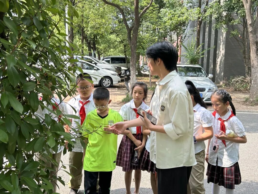 随后,师生们带着新学的理论知识,跟随邵宇凡开启了校园植物探索。道路两旁高大的香樟树下,邵宇凡引导大家触摸其革质叶片和独特叶脉,感受植物适应环境的智慧;在草丛中发现成簇的酢浆草时,他揭秘这种植物根部的酸甜滋味承载着许多人的童年记忆;当队伍行至宿舍区,叶片呈现特殊红色的红叶石楠更引得众人连连惊叹……在邵宇凡的讲解中,每株看似平凡的植物都焕发出独特的生命力,校园角落也成为了生动的自然课堂。这场理论与实践交融的探索之旅,不仅让大家收获了知识,更培养了观察身边自然世界的全新视角。