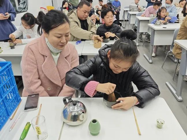 “原来点茶这么有意思!”“我打出的泡沫像棉花糖一样!”孩子们一边展示自己的“作品”,一边互相分享心得。家长们则在一旁拍照记录,不少家长表示:“这样的活动太有意义了,既能让孩子了解传统文化,又能增进亲子互动,比单纯看书有趣多了!”