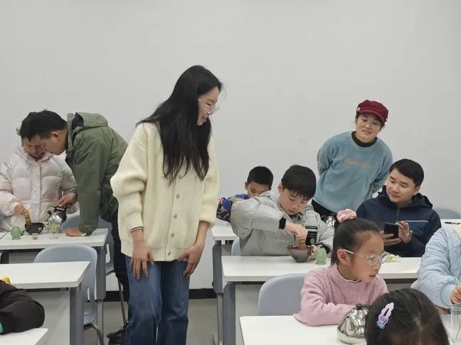 进入最令人期待的实操环节,小朋友们早已跃跃欲试!在家长的陪伴与助教老师的指导下,孩子们化身“小小点茶师”,一步步解锁点茶技艺: