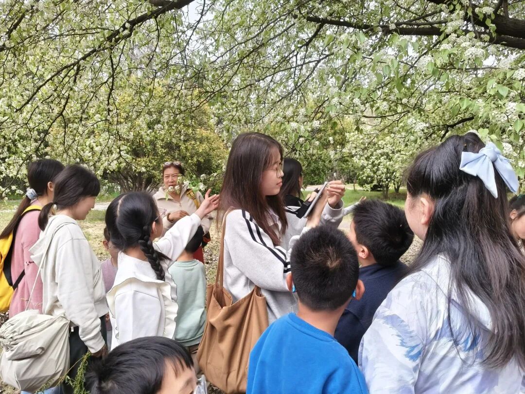 在观察过程中,老师还现场讲解梨树的枝叶形态、生长习性,结合校园内的梨树,介绍其生长环境与地域分布特点,并引导小朋友们尝试辨别周边的梨花与其他春日花卉,巩固课堂上学到的辨别技巧。小朋友们认真观察、仔细记录,在自然中亲身感受梨花的形态之美,也体会到植物观察的乐趣。