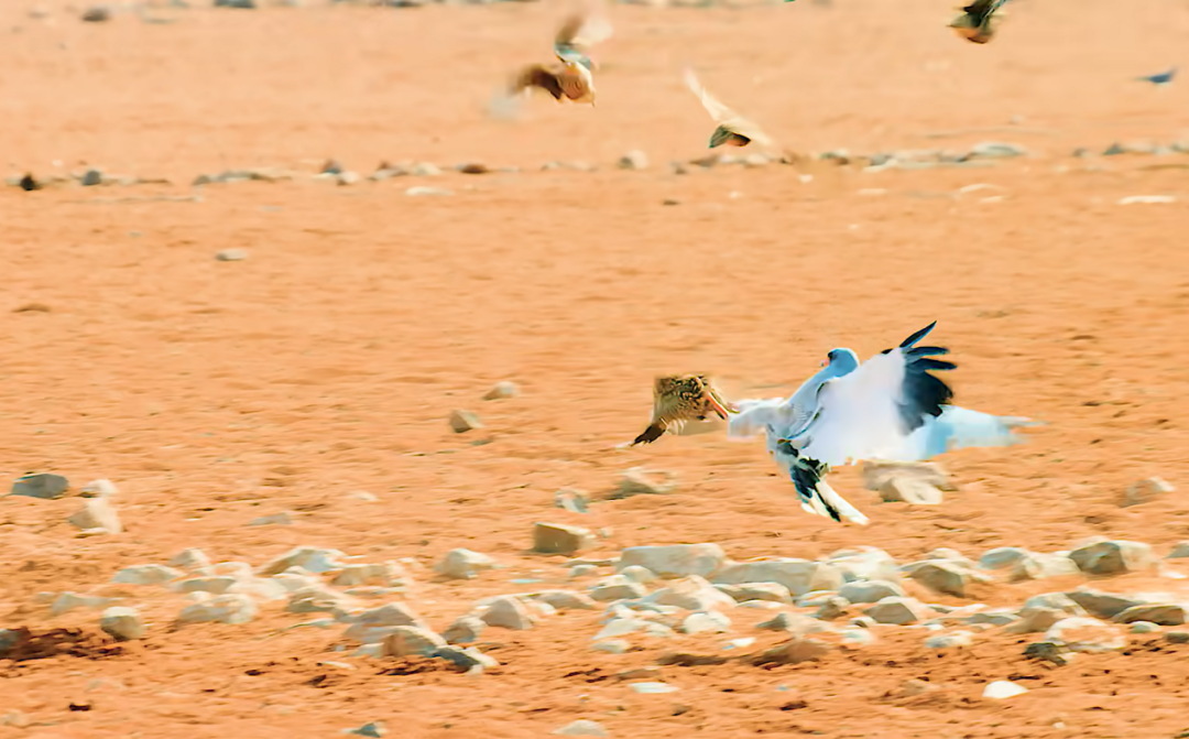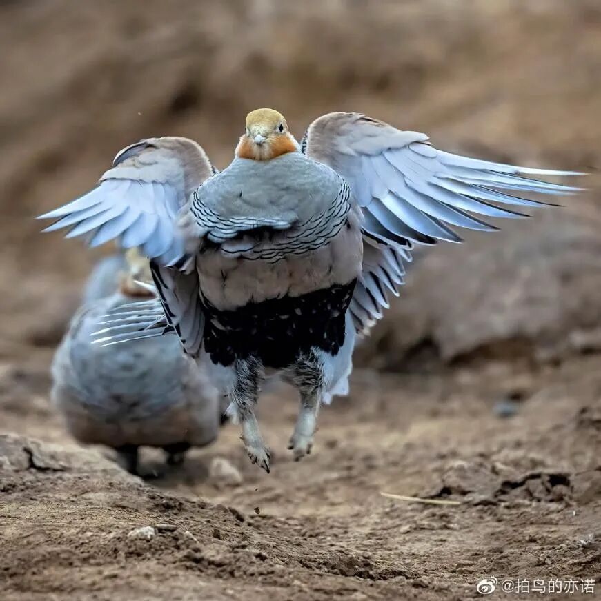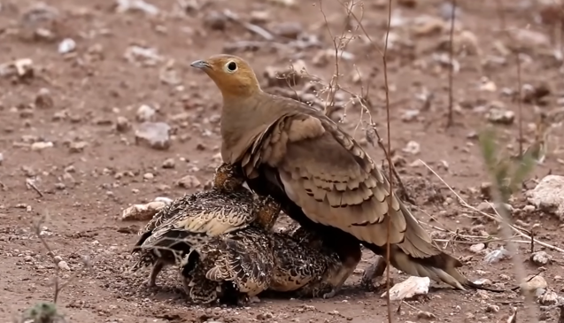 除了羽毛储水的绝技,沙鸡的诸多习性都彰显着对荒漠环境的完美适应:首先在食性上,沙鸡以植物种子和嫩芽为主要食物,短而坚硬的喙能高效啄食沙地上的种子,食物中的水分可部分缓解干旱压力。沙鸡的飞行能力很强,尖长的翅膀赋予其每小时 60公里以上的飞行速度,既能快速往返水源地,也能在遭遇天敌时迅速逃生,它们飞行时翅膀会发出 “呼呼” 的声响,成为荒漠中独特的声音标识。最后就是它们的繁殖策略,雌雄鸟轮流孵卵,雄鸟负责夜间孵化,利用厚实羽毛抵御低温,而雌性则在白天坐在卵上,卵通常在20-25天后即可孵化成功。