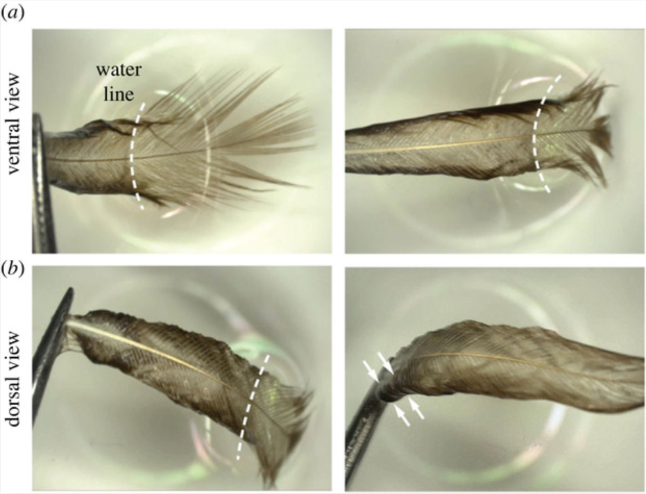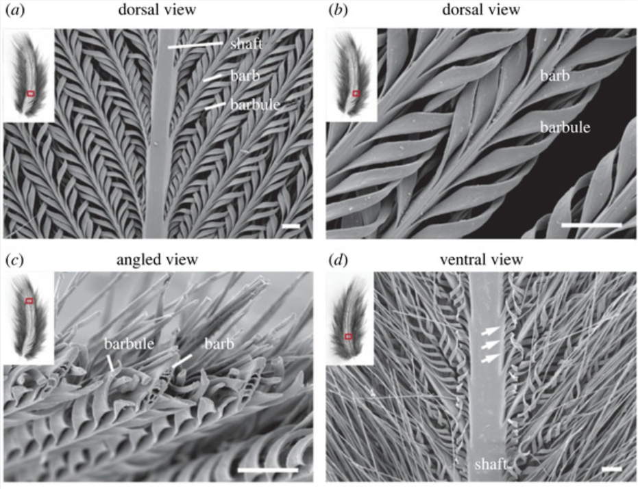而在外侧防护区,外层羽小枝呈平直结构,当羽毛吸满水后会向内弯曲,形成盖子的形状,将水分封闭在羽毛内部,有效减少飞行中因气流冲击和蒸发造成的损耗。