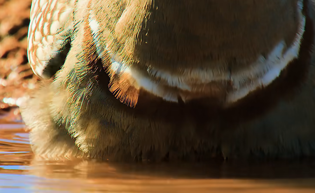 普通鸟类的羽毛依靠羽小枝上的钩状结构紧密连接,形成防水的光滑羽面;而雄沙鸡的腹部羽毛演化出 “内外分区” 的特殊设计[1]: