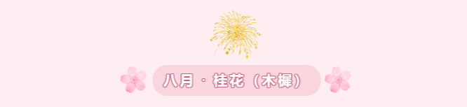木樨的花簇生于叶腋,花小如粟,有乳白、金黄、橙红等色,分别称为银桂、金桂、丹桂。花期9-10月,正值农历八月,故八月雅称“桂月”。 其花虽小,香气却浓郁悠远,有“九里香”“十里香”之誉。